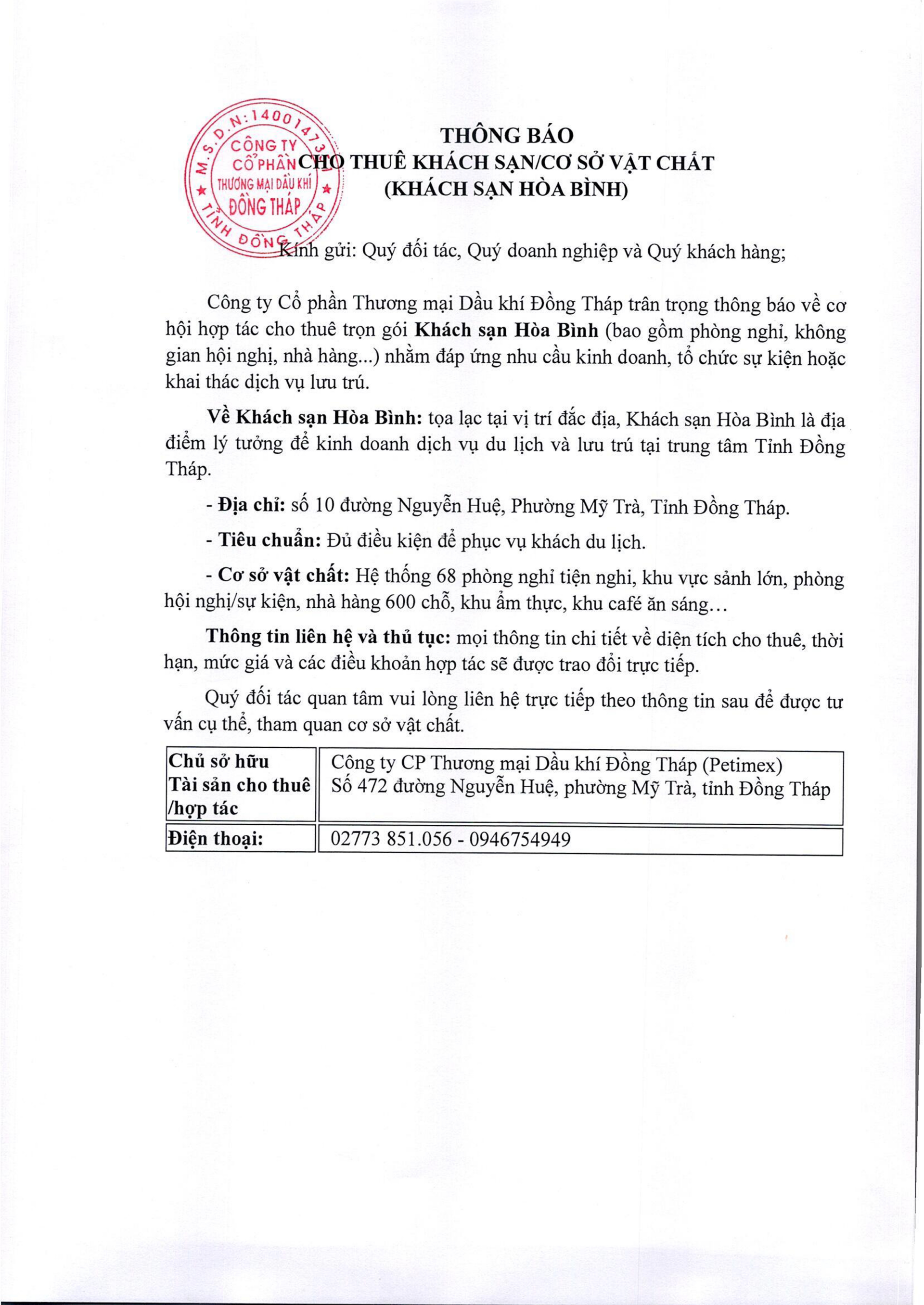 THÔNG BÁO CHO THUÊ KHÁCH SẠN/CƠ SỞ VẬT CHẤT: KHÁCH SẠN HOÀ BÌNH – Địa chỉ: Đường Nguyễn Huệ, Phường Mỹ Trà, tỉnh Đồng Tháp.