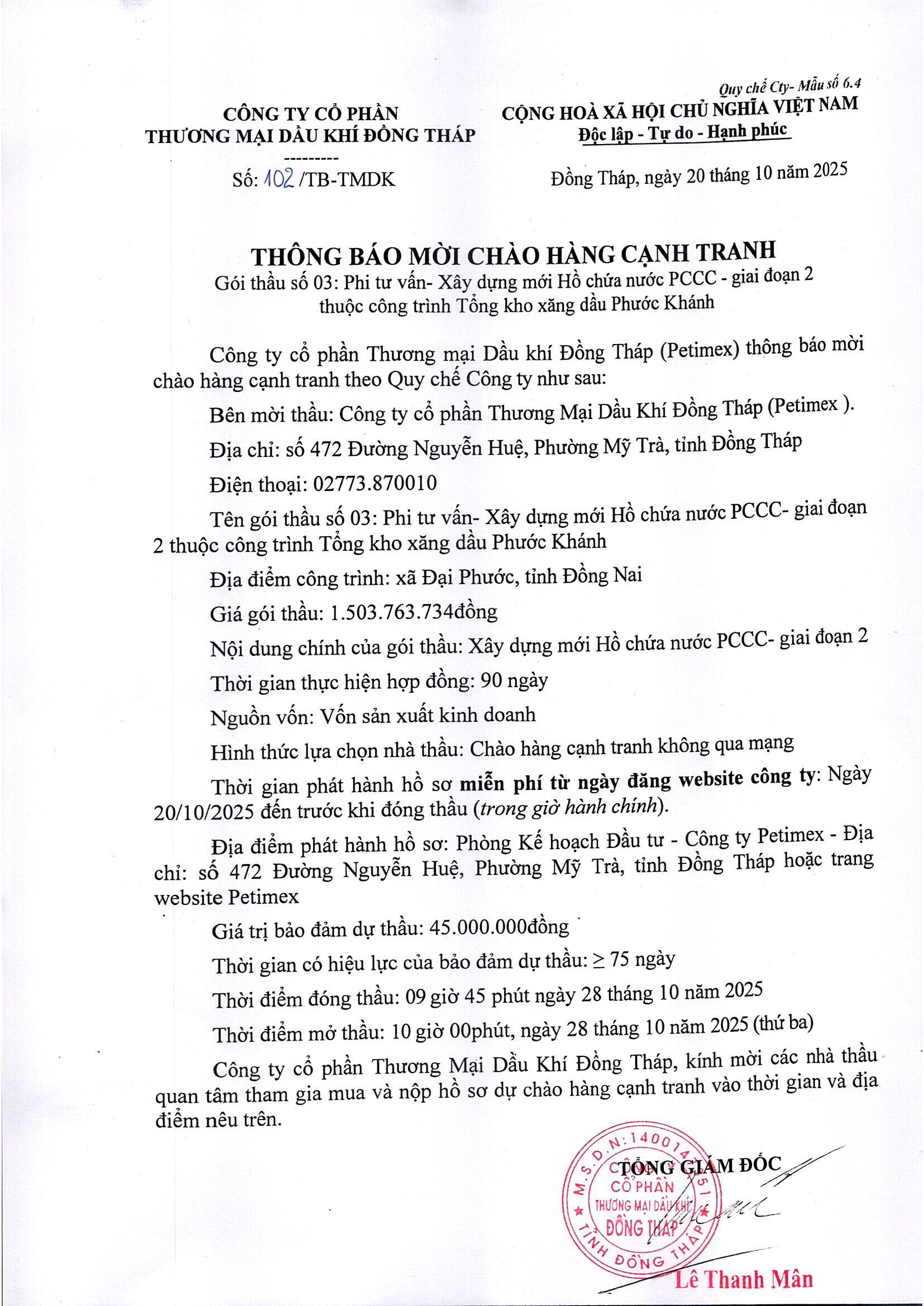 THÔNG BÁO MỜI CHÀO HÀNG CẠNH TRANH (Gói thầu số 03: Phi tư vấn – Xây dựng mới hồ chứa nước PCCC – Giai đoạn 02: Thuộc Tổng kho XD Phước Khánh)