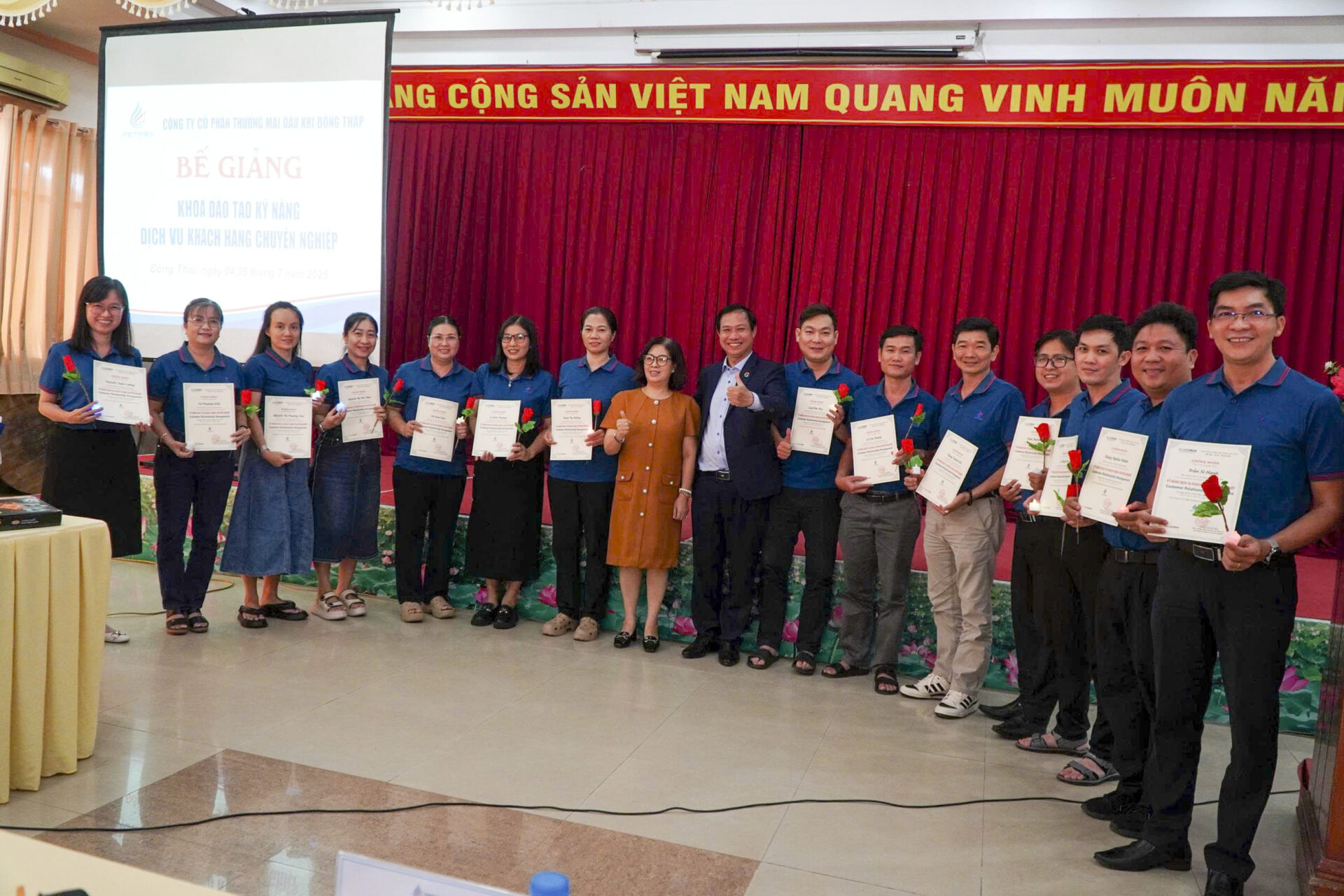 Sáng ngày 04/7/2025 tại Hội trường Công ty, Petimex tổ chức khai giảng khoá đào tạo “Kỹ năng dịch vụ khách hàng chuyên nghiệp” cho 125 cán bộ, người lao động. Khoá đào tạo được chia làm 2 lớp (ngày 04,05/7/2025 và ngày 12,13/7/2025).