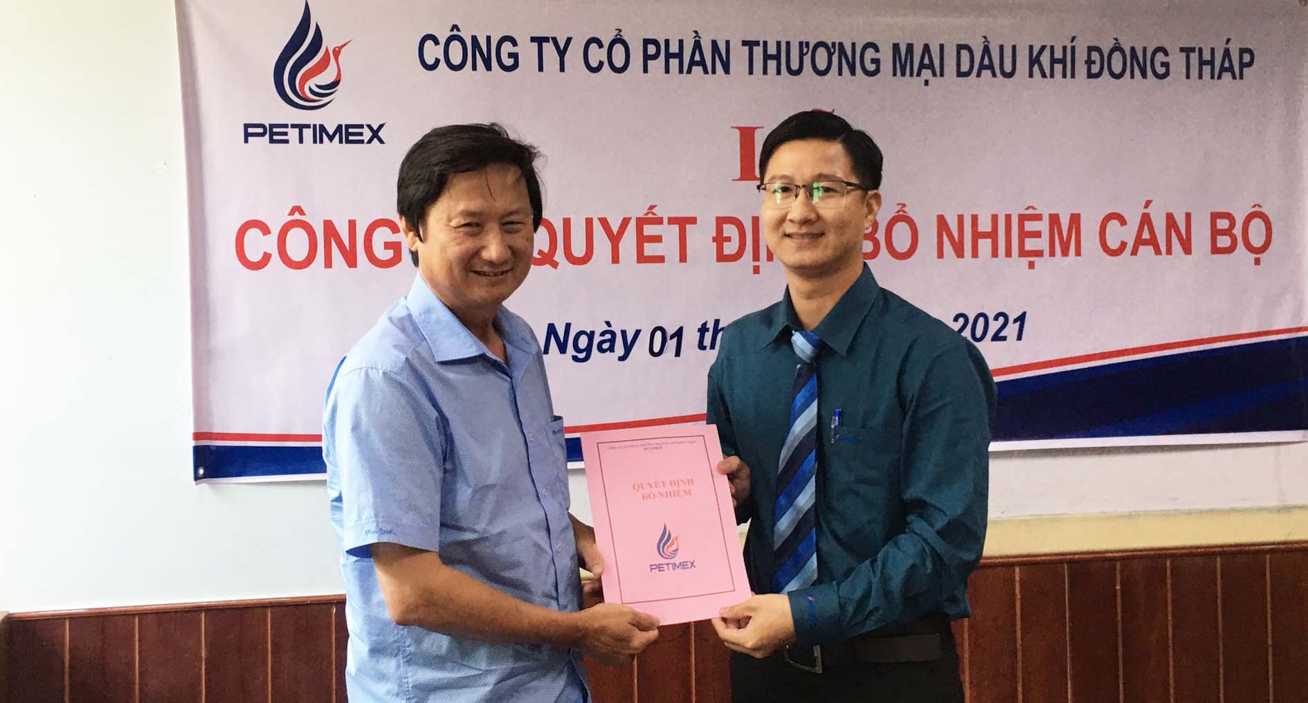 Thực hiện Nghị quyết 004/NQ-HĐQT-TMDK ngày 12/3/2021 của Công ty cổ phần thương mại dầu khí Đồng Tháp (Petimex) về việc sắp xếp điều chuyển và bổ nhiệm nhân sự đảm nhiệm chức danh lãnh đạo tại các Chi nhánh trực thuộc Công ty.