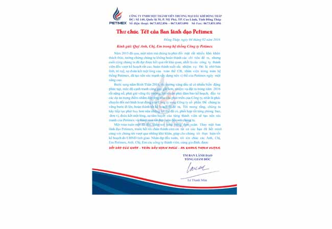 Thư chúc Tết Xuân Bính Thân 2016 của Ban lãnh đạo Petimex