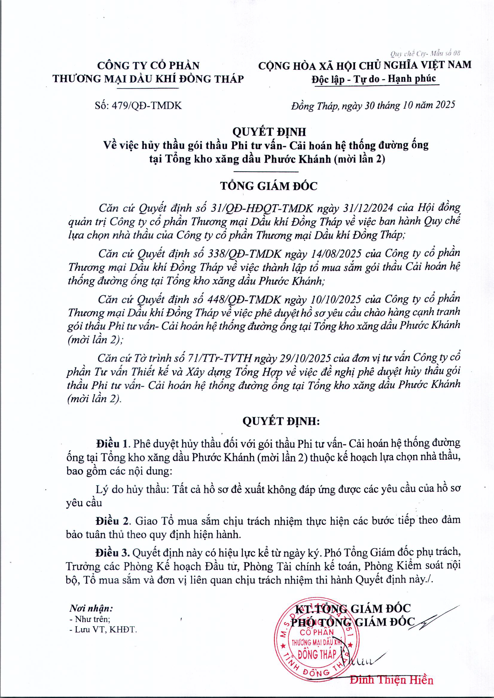 Quyết định hủy gói thầu Phi tư vấn – Cải hoán hệ thống đường ống tại Tổng kho XD Phước Khánh (mời lần 2): -QD_479-huy-Cai-hoan-duong-ong-PK-30.10.25.pdf