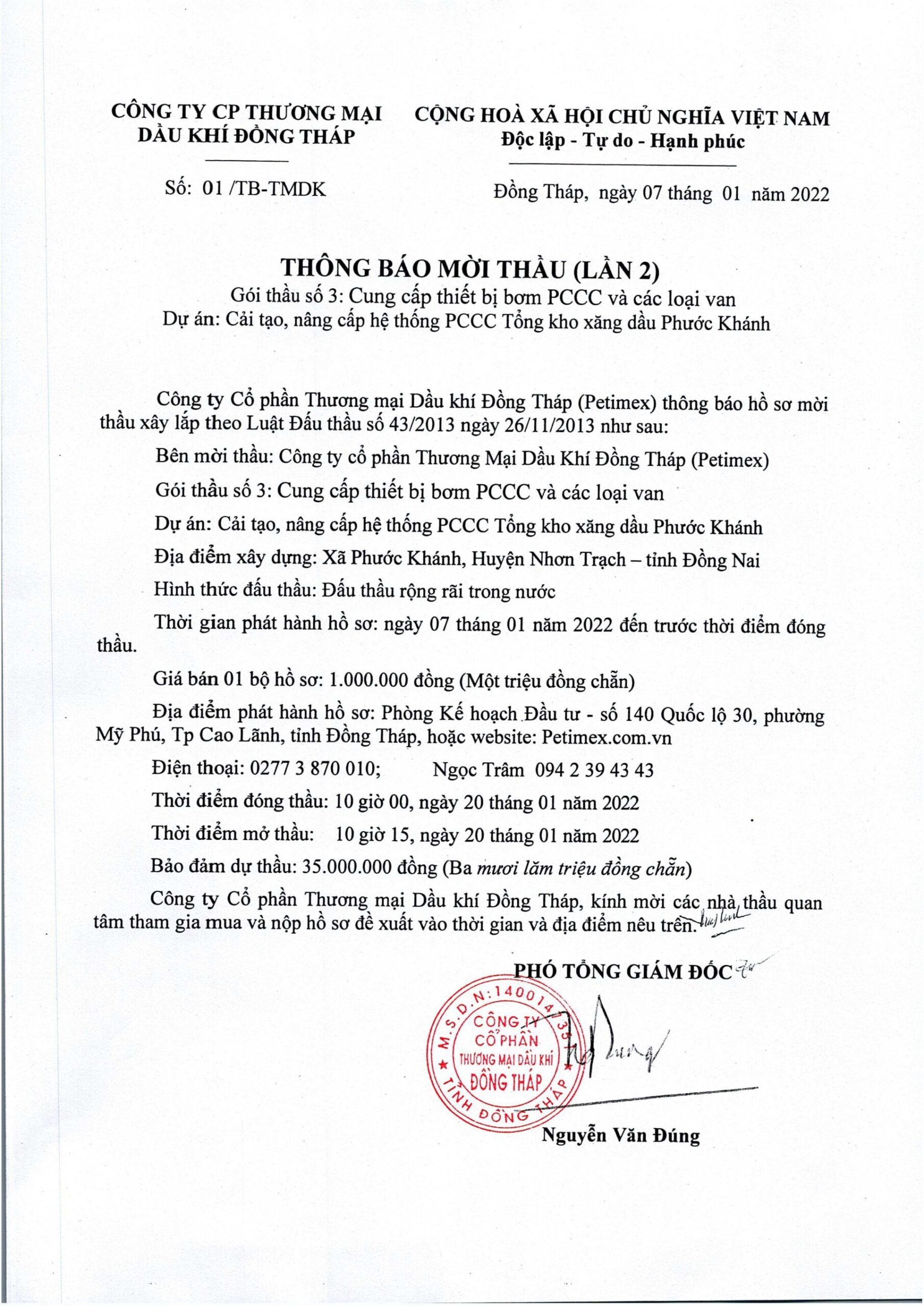 THÔNG BÁO MỜI THẦU (LẦN 2) Gói thầu số 3: Cung cấp thiết bị bơm PCCC và các loại van, Dự án: Cải tạo, nâng cấp hệ thống PCCC Tổng kho xăng dầu Phước Khánh